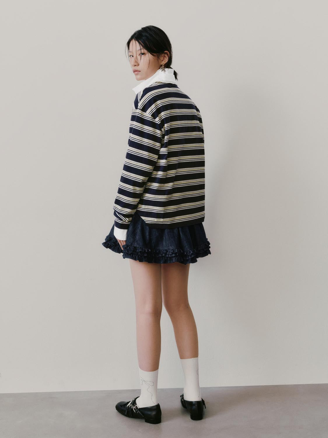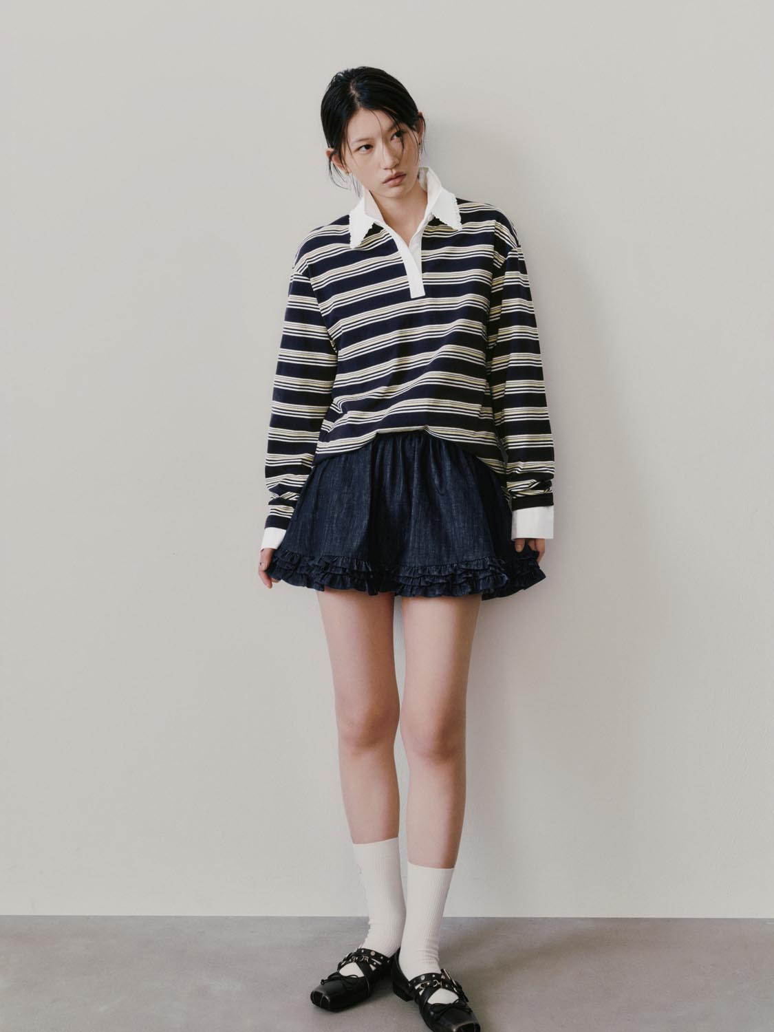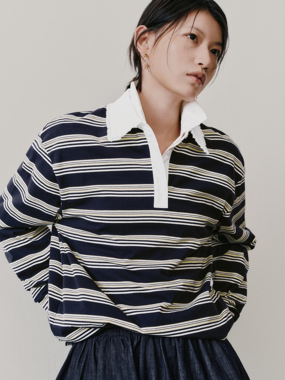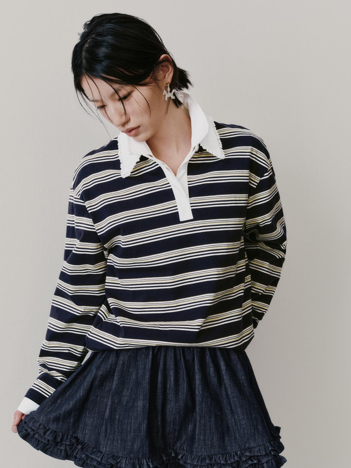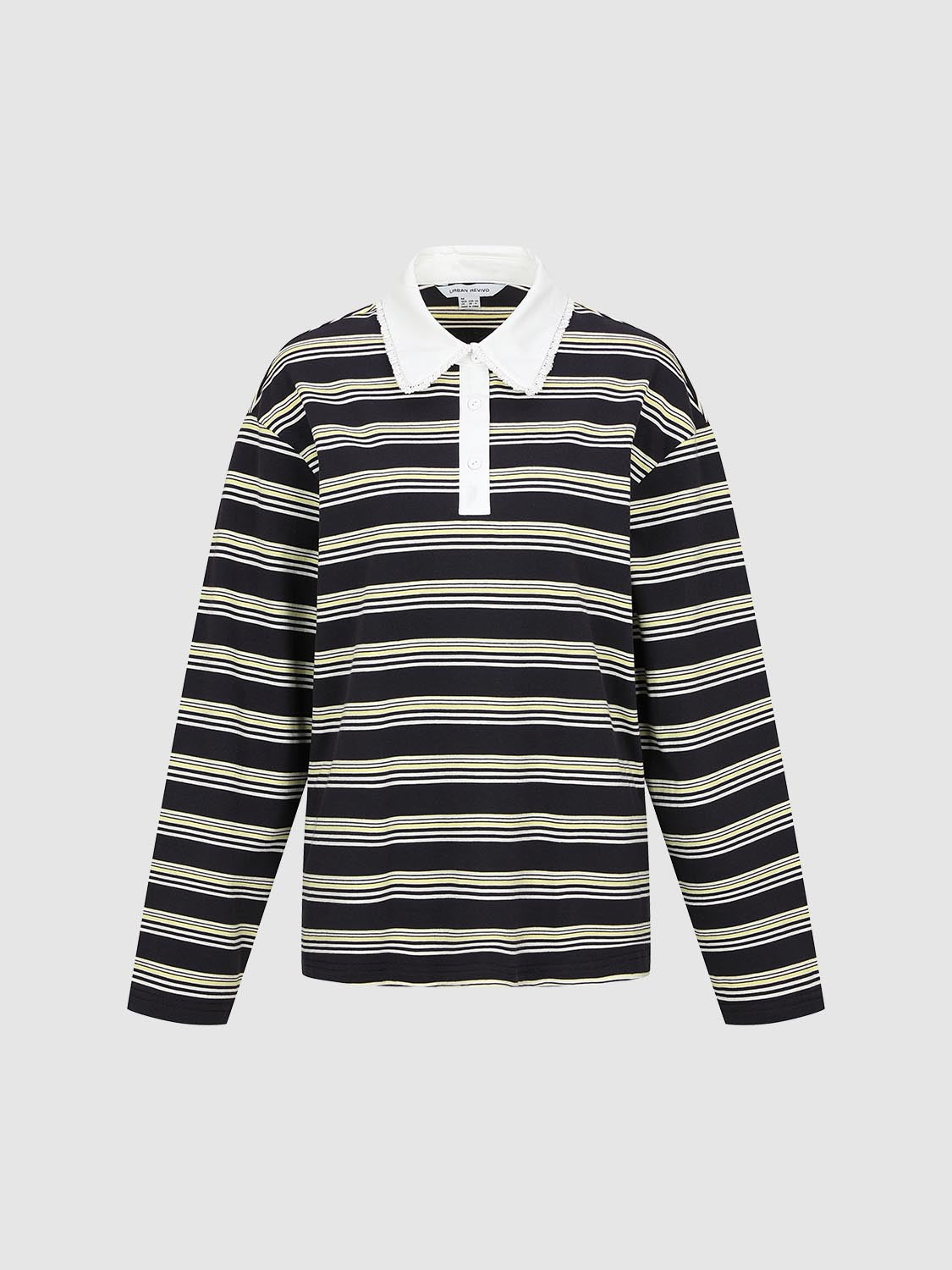 Lace Trim Collared Striped Long Sleeve T-Shirts