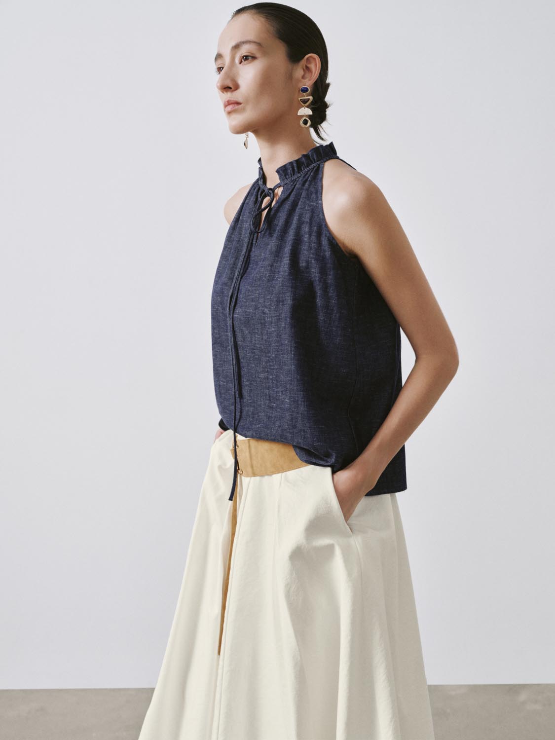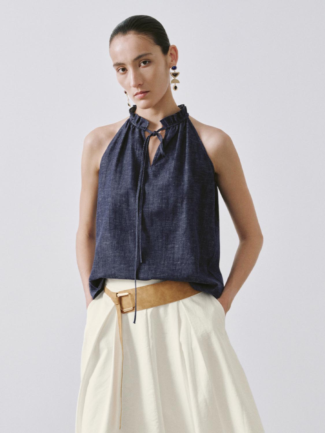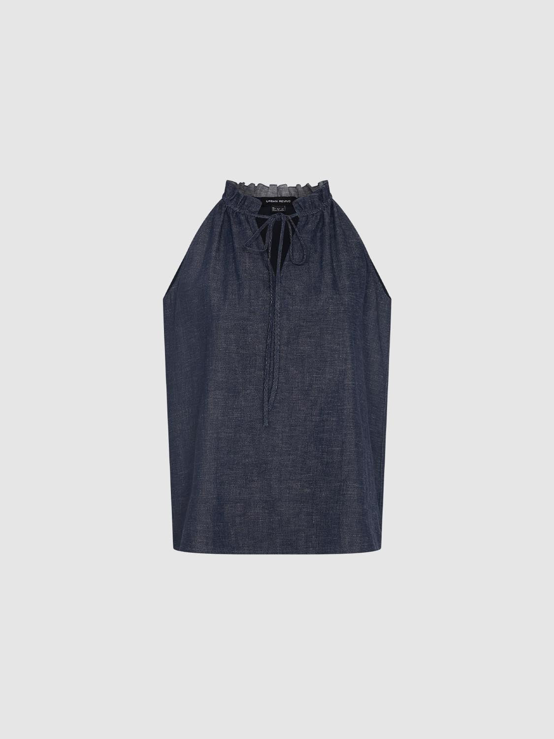 Ruffle Tie Neck Sleeveless Denim Shirts