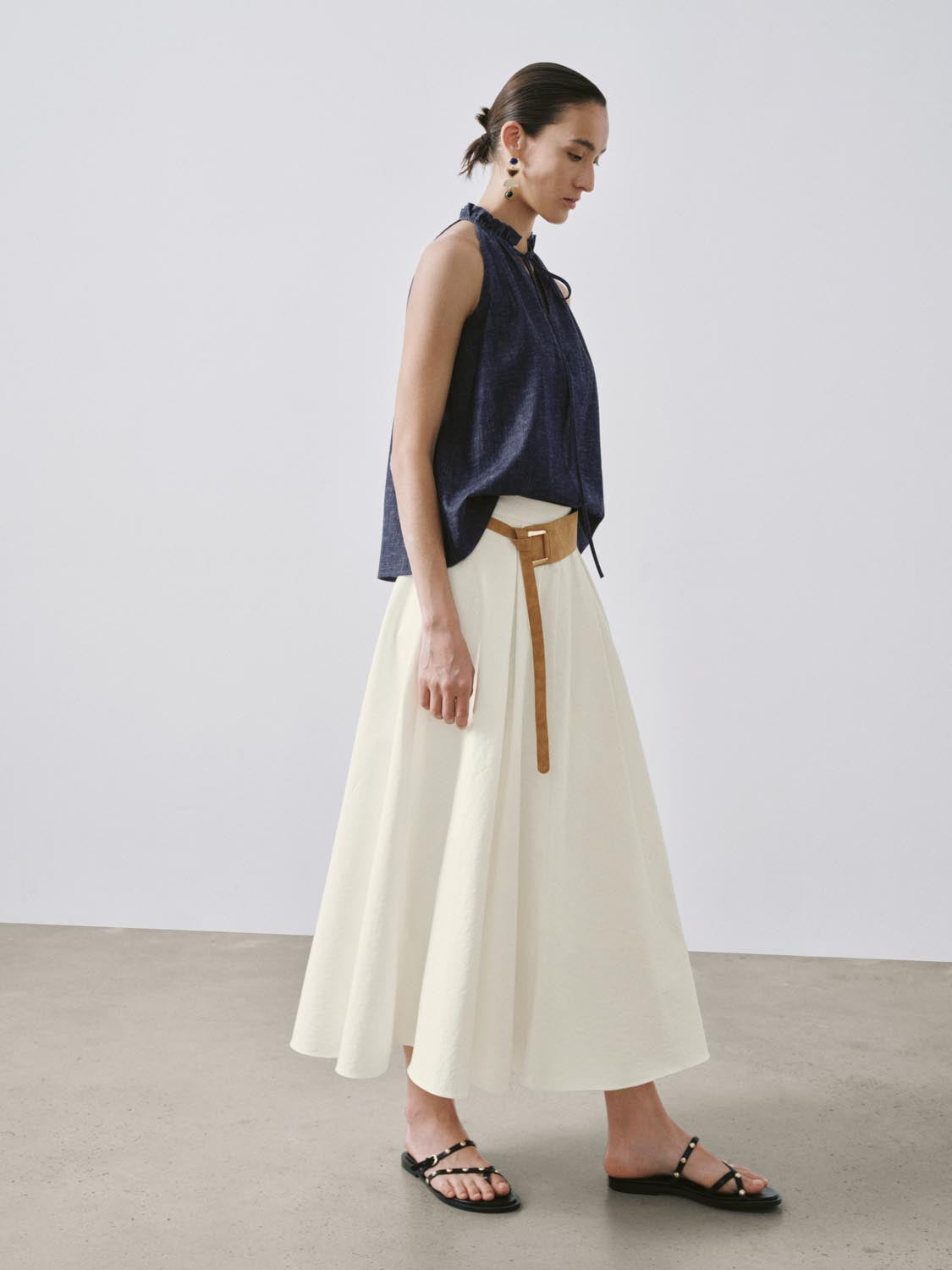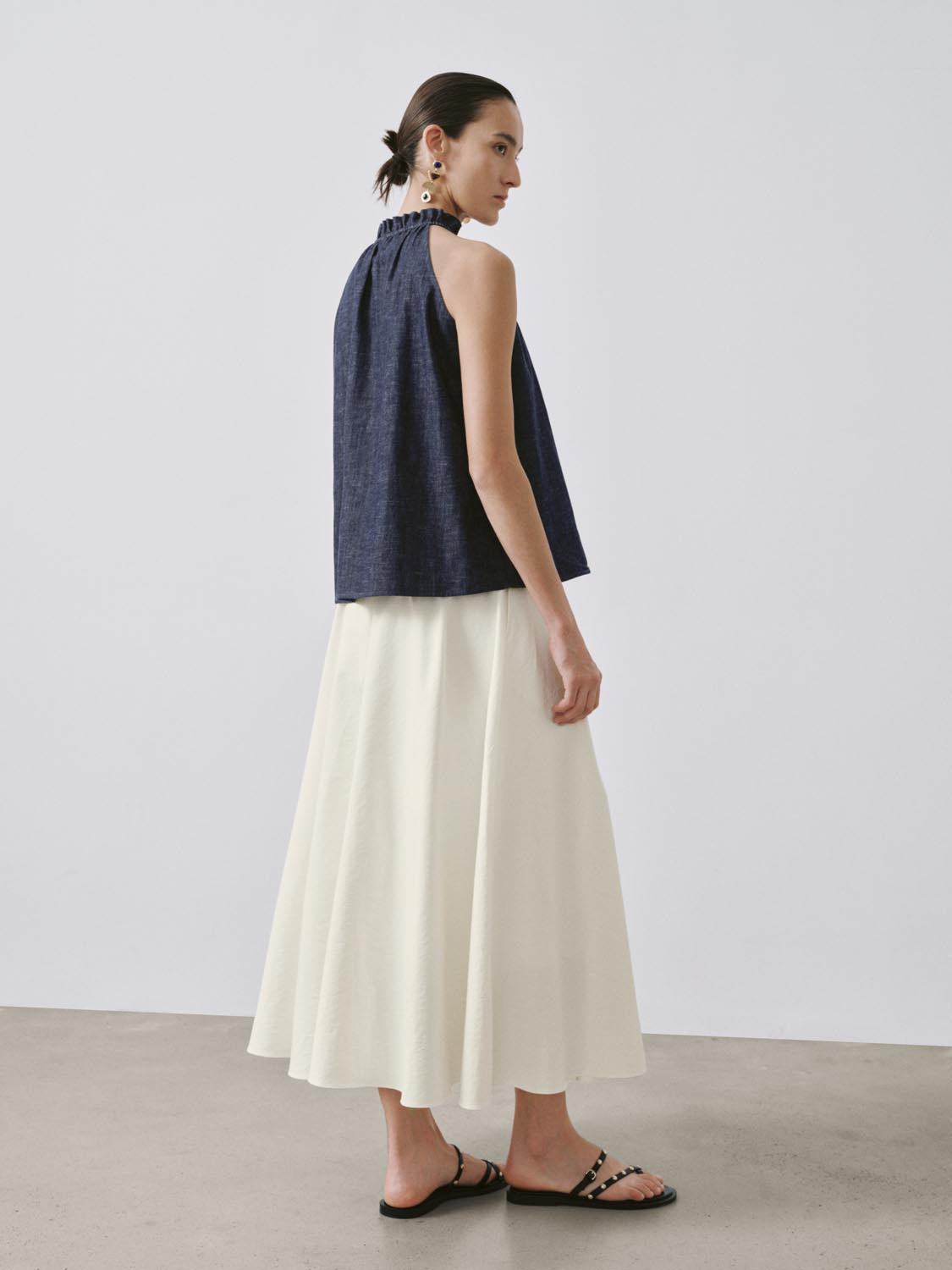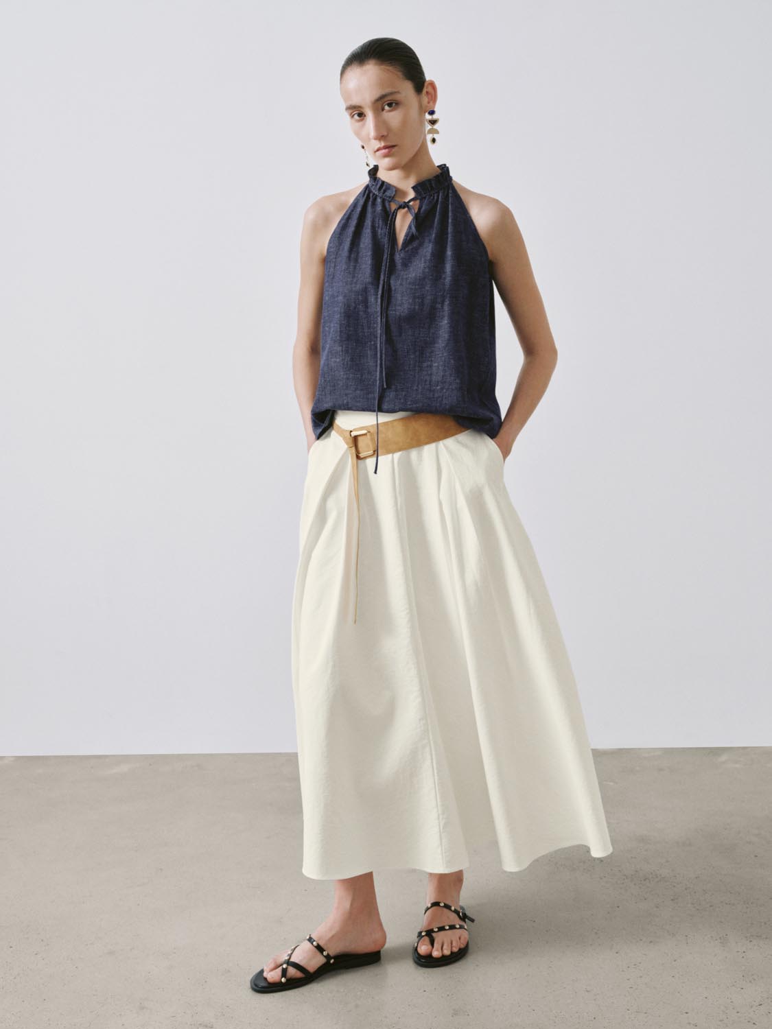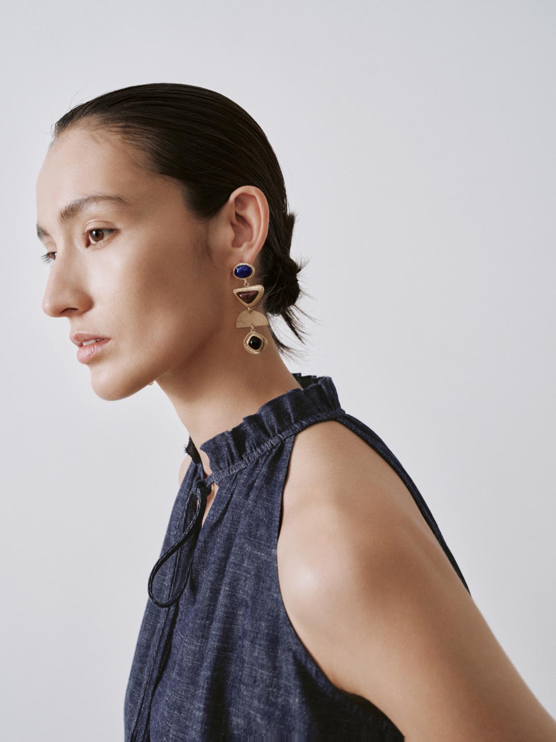 Ruffle Tie Neck Sleeveless Denim Shirts